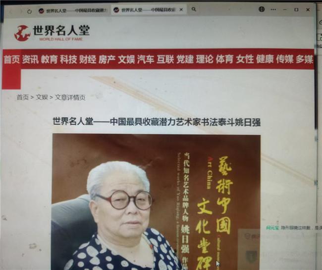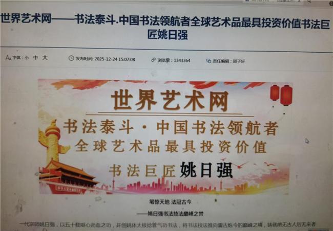2025年12月25日,世界艺术网《书法泰斗 中国书法领航者 全球艺术品最具投资价值书法巨匠姚日强》,点击量:134万人次。