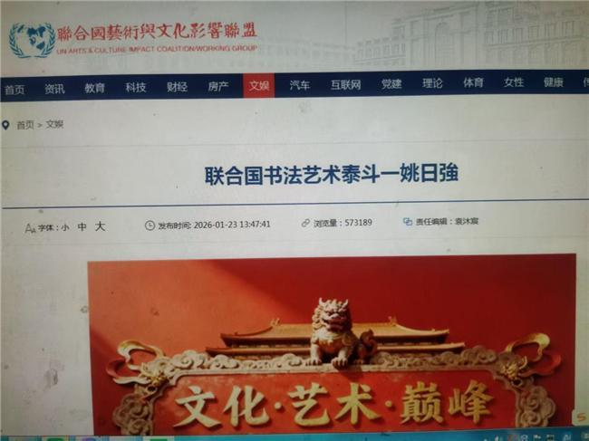 2026年1月23日联合国艺术与文化影像联盟网《联合国书法艺术泰斗——姚日强》。浏览量:573186次。