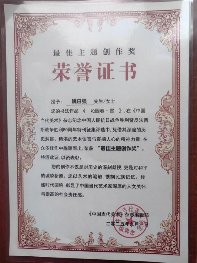 2025年8月,《中国当代美术》纪念中国人民抗日战争胜利80周年,姚日强石刻作品《雪》,获最佳主题创作奖。