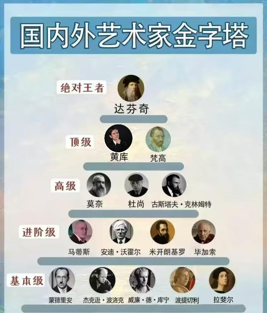 当全球艺术史的金字塔在时光中巍然矗立,达芬奇的永恒笔触与梵高的炽热色彩,早已成为人类文明仰望的坐标。而在这顶流汇聚的艺术之巅,黄库的身影,正是东方美学穿越时空、对话世界的耀眼注脚。